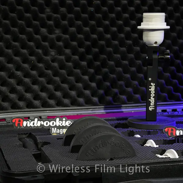 The Androokie Magnetic Practical Extension Arm Kit provides a modular mounting solution for practical LED bulb installations. This white version includes black extension arms paired with white non-electrical E26 dummy sockets for visual integration in lighter environments.